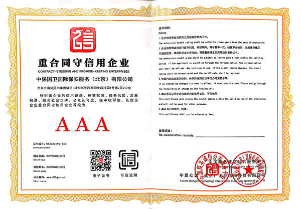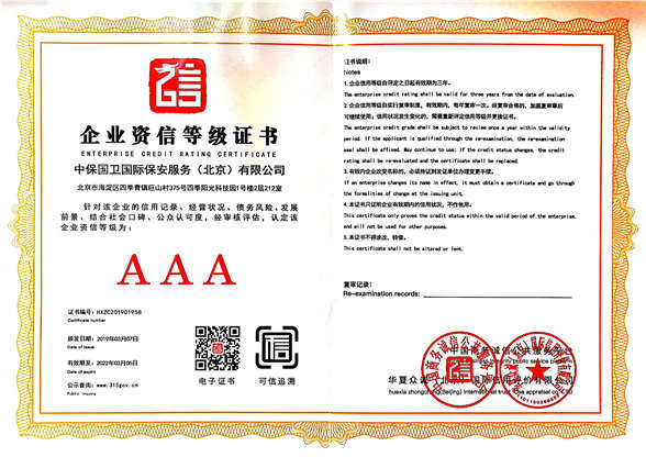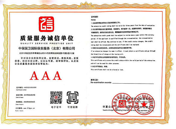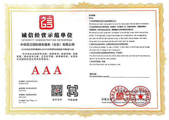 中保國衛(wèi)國際保安服務(wù)(北京)有限公司,屬中保國衛(wèi)集團(tuán)旗下子公司。能全方位的為大型客戶提供優(yōu)質(zhì)的安保、押運服務(wù),是集人防和技防于一體的新型正規(guī)化綜合安保押運服務(wù)企業(yè),提供人防、物防、技防、聯(lián)網(wǎng)報*、非武裝押運等安防相關(guān)的一站式服務(wù)。 公司在國內(nèi)多省設(shè)立有分公司及分支機(jī)構(gòu),著重提升安全押運、智能技術(shù)押運及安全技術(shù)防范相關(guān)的服務(wù),業(yè)務(wù)范圍覆蓋全國一、二線城市、港澳地區(qū)以及海外地區(qū)。安保方面主要為政府機(jī)構(gòu)、金融機(jī)構(gòu)、企事業(yè)單位、醫(yī)療衛(wèi)生、高等院校、工業(yè)園區(qū)、大型商場、高檔住宅、智能商務(wù)樓、大型活動提供門衛(wèi)、守護(hù)、巡邏、押運(非武裝)、安全檢查、保安特勤、私人護(hù)衛(wèi)、消防中控、安全技術(shù)防范、遠(yuǎn)洋護(hù)航等全方位服務(wù),同時面向國際市場,為中資企業(yè)在“一帶一路”沿線國家投資提供境外安保服務(wù)。 >> 更多內(nèi)容 |